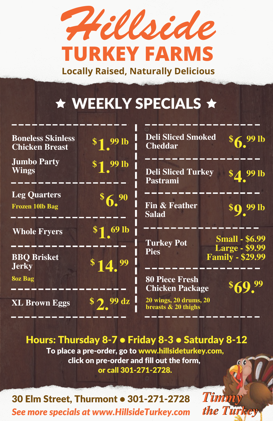 - Whole Turkeys (10-24lbs) – $3.25/lb.
