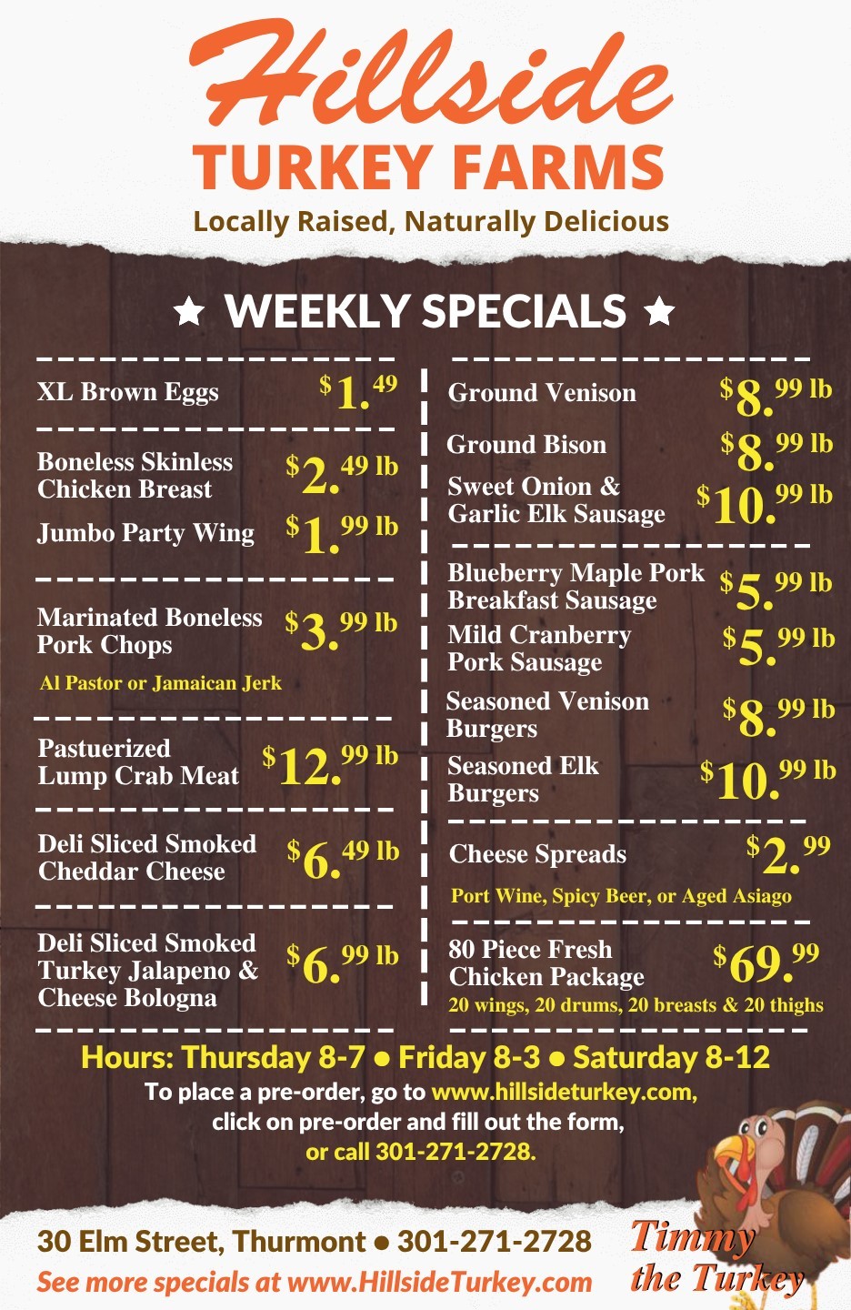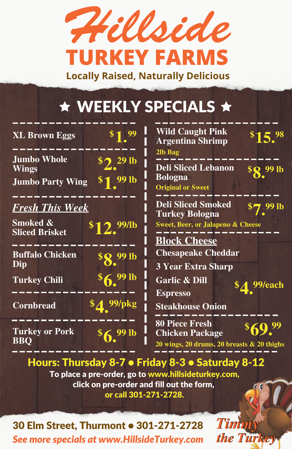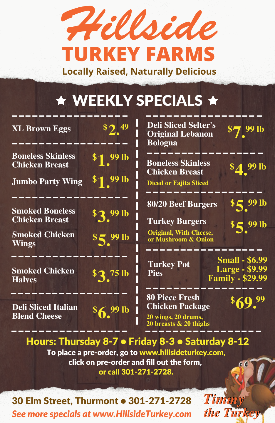 - Whole Turkeys (10-24lbs) – $3.55/lb.