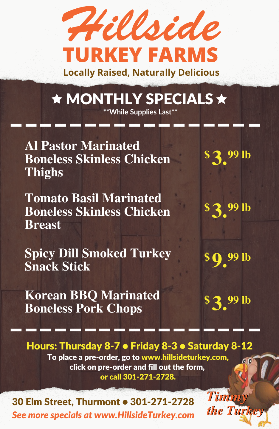 - Whole Turkeys (10-24lbs) – $3.25/lb.